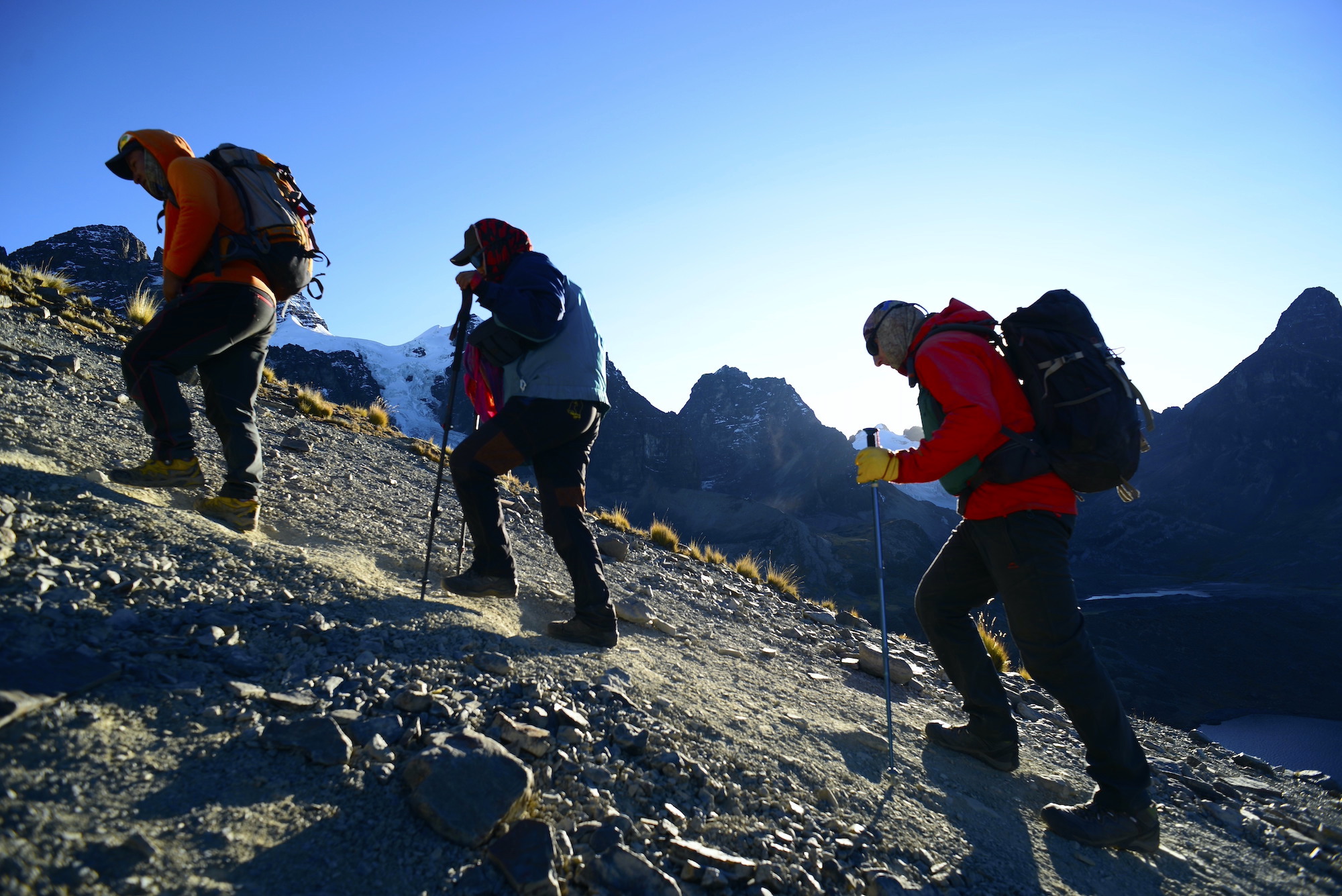 Após o café da manhã, iniciaremos o trekking de aproximadamente 3 horas até a Laguna Chiar Khota, o acampamento base do Condoriri. O trajeto é suave e nos colocará aos pés de montanhas majestosas. Após montarmos acampamento e almoçarmos, teremos uma tarde de aulas práticas e cenários simulados de atendimento a pacientes em ambiente de montanha. Pernoite em barracas.