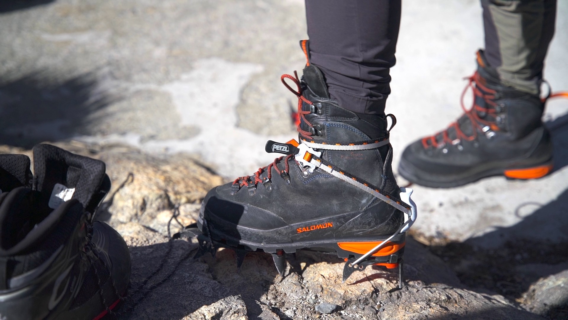 - Técnicas de deslocamento com bota em neve, rocha, cascalho e terreno misto